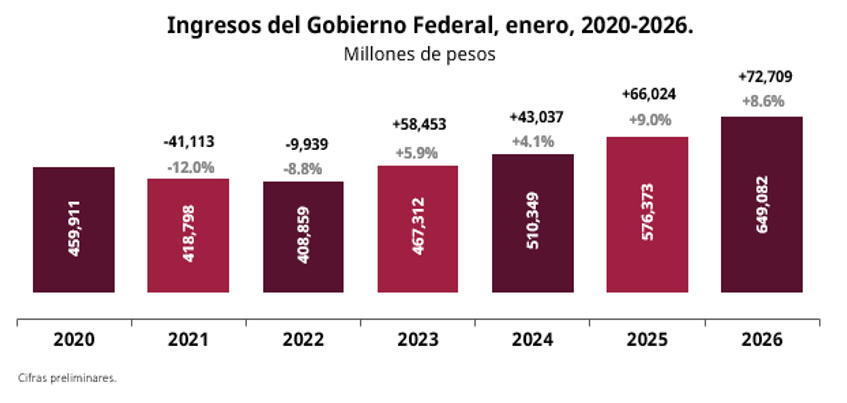 En enero de 2026, los ingresos del Gobierno Federal alcanzaron 649 mil 82 millones de pesos, lo que representó un crecimiento real de 8.6% frente al mismo mes del año anterior, informó el Servicio de Administración Tributaria (SAT).