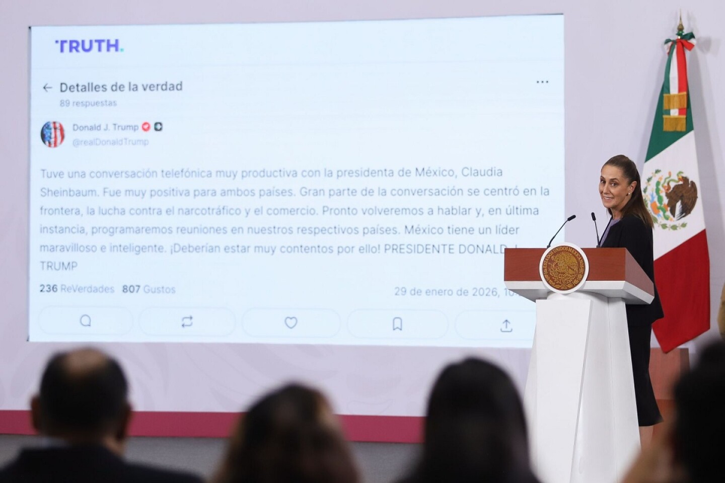 El presidente de Estados Unidos, Donald Trump, aseguró que México tiene una “líder maravillosa e inteligente” en Claudia Sheinbaum, tras una conversación telefónica sostenida el jueves 29 de enero de 2026. El republicano compartió el mensaje a través de su red social Truth Social.